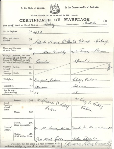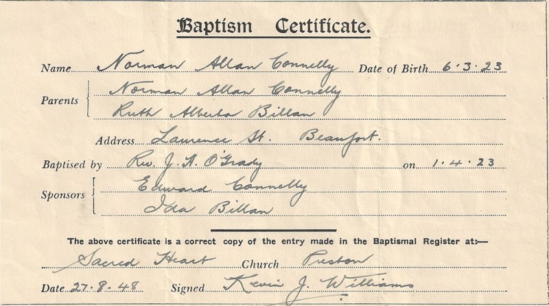 References found (entries & photos) : National Archives of Australia (Barcode 6110861 [OPEN]), WW2 Nominal Roll, Australian War Memorial, Baptism certificate (G_CONNELLY_12), G_CONNELLY_2.jpg, G_CONNELLY_1.jpg, G_CONNELLY_8.jpg, G_CONNELLY_5.jpg, G_CONNELLY_6.jpg, G_CONNELLY_9.jpg, G_CONNELLY_13.jpg, Postcard sent home to Mum (G_CONNELLY_10), Scouts and survival Coburg newspaper article (G_CONNELLY_4), Discharge certificate (G_CONNELLY_3), Awarded medals (G_CONNELLY_7), Marriage certificate (G_CONNELLY_11), Submitted story