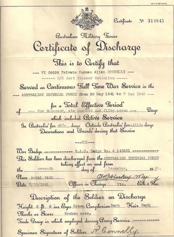 Service & personal summary At discharge : 5 feet 6 inches, brown eyes, dark complexion, dark hair. Marks / scars : broken nose. Full time war service : A.I.F. 26/05/1941 to 07/12/1945 which included 1657 days active service (147 days within Australia & 1510 days overseas). Operational service : Middle East & Java. War badge no. A145621. Discharge certificate no. 314845.