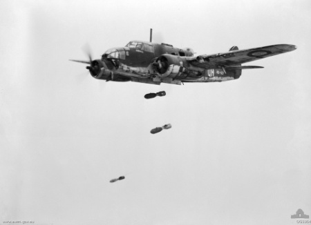 Hudson bomber - Photo Allied reconnaissance aircraft / light bomber. Entered service 1940. 4 - 5 crew. Wing span 19.96 metres. Length 13.5 metres. Weight (unladen) 5,969 kg. Ceiling 7,620 metres. Maximum range 2,180 km. Speed 406 km/h. Armament up to 7 x .303 inch machine-guns and 726 kg of bombs. AWM id no. AC0069