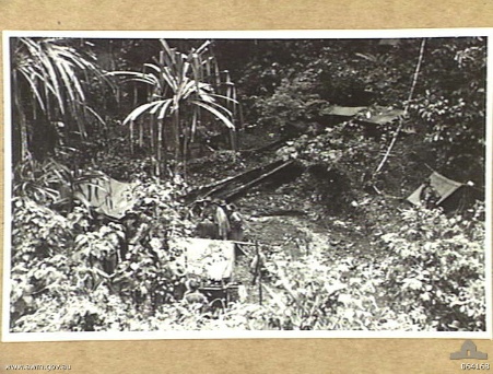 Canning's Saddle, New Guinea. 1944-01-21. The advanced Regimental Aid Post (foreground) and the kitchen of the 2/12th Infantry Battalion (background). The Regimental Aid Post is manned by personnel of the 2/2nd Australian Pioneer Battalion. AWM id no. 064168