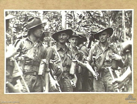 Mount Prothero area, New Guinea. 1944-01-21. Personnel of the 2/2nd Pioneer Battalion who have just returned from a patrol of the Canning Saddle area. Identified personnel are:- NX88364 Private R. Ginnane (1); NX87479 Private W. Norris (2); QX51235 Private F. J. P. Gallagher (3); NX87399 Private B. K. Metcalf (4). AWM id no. 064181