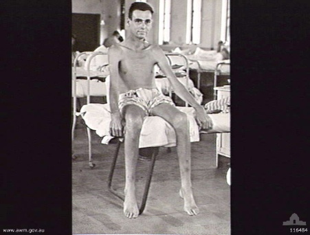 Circa 1945 (post war). Heidelberg Military Hospital, Victoria. Photo taken by the Herald newspaper of VX38234 Private E. S. Veal after repatriation from Changi, Singapore. Photo courtesy of M. Young (daughter of VX38234 E. S. Veal) id no. M_YOUNG_4