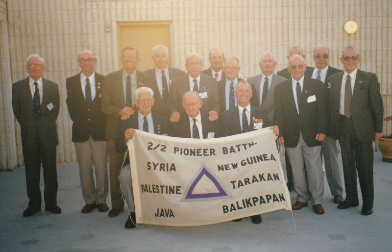 Group photo with 2/2 Pioneer banner. Photo courtesy of G. Atkins (daughter of VX55245 F. J. Barnstable) id no. G_ATKINS_24