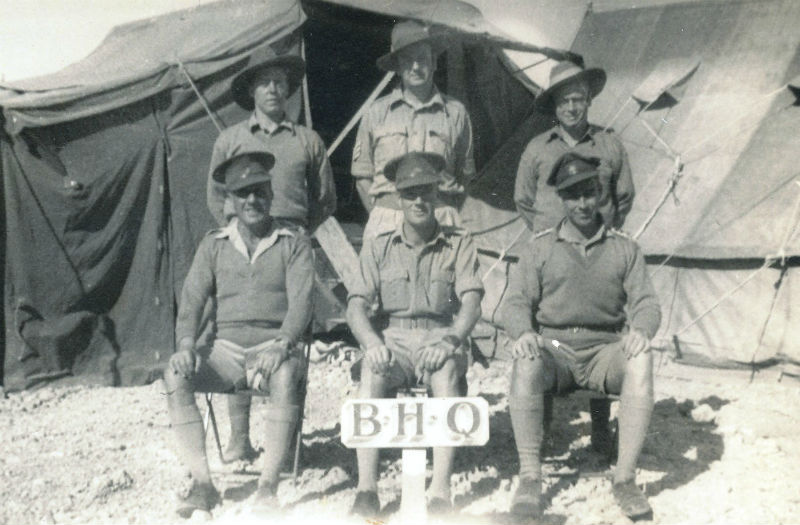Circa 1941. Middle East. Battalion Headquarters. Identified personnel : back row third from left VX22587 Private Basil Pugh. No notation on reverse. Photo courtesy of L. Boromeo (daughter of VX22587 H. B. A. Pugh) id no. L_BOROMEO_7