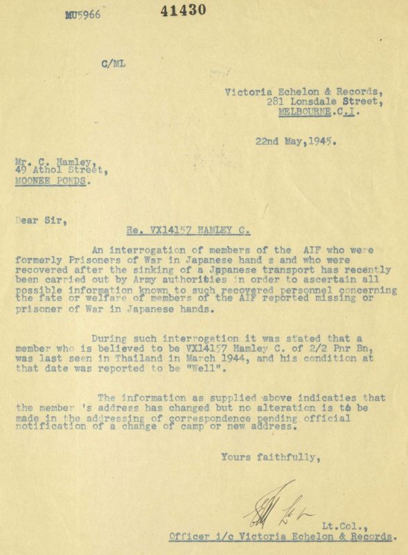 Background : Son of Colin Eric and Sadie Doris Hamley, of Moonee Ponds, Victoria, Australia. Brother of VX19013 Donald John Hamley (2/2 Pioneer). Attended No. 9 Regiment Signals (Infantry) Refresher Australian Imperial Forces (Middle East) Signal School from 06/09/1941 to 26/09/1941 [Qualified]. Worked in No. 5 Branch on the Burma Railway.