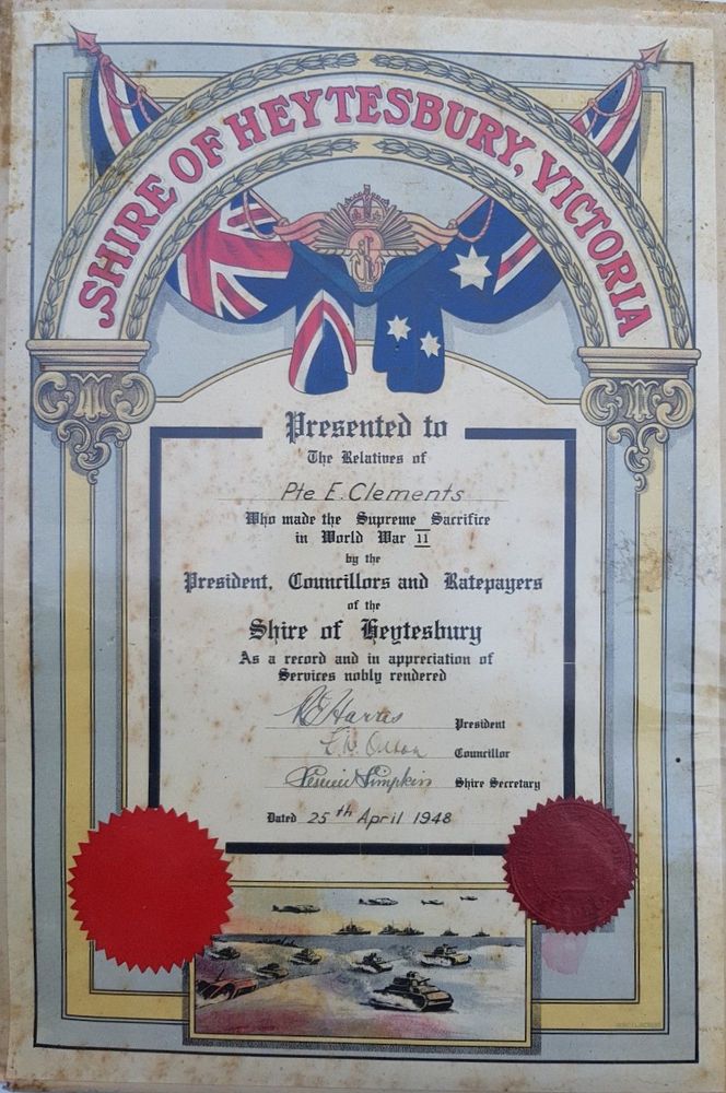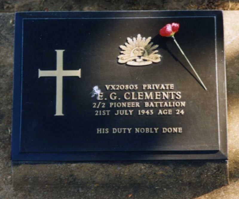 Background : Son of Robert Badger Clements and Agnes Orwell Clements, of Cobden, Victoria, Australia. Third son of four others serving in the Army. Local football team member and a keen sportsman. Shire of Heytesbury commemorative scroll to his family reads : Presented to the Relatives of Pte E. Clements who made the Supreme Sacrifice in World War II by the President, Councillors and Ratepayers of the Shire of Heytesbury as a record and in appreciation of Services nobly rendered. 25/04/1948. Japanese Java Party 6 Prisoner of War. 04/01/1943 Embarked Java on Usu Maru with 1970 Prisoners of War. 07/01/1943 Disembarked Singapore and party split up. 20/01/1943 From Singapore overland on Train 37 to Thailand with 625 Prisoners of War. A Red Cross enquiry was made about Pte. Clements, enquiry number 43146 : CLEMENTS Given Name(s) or Initials: E G. Military Service Number or Last Known Location: VX20803 Missing, Wounded and Prisoner of War Enquiry Card Index Number: 43146. 191383. Item: [2016.0049. 09867] "Clements, E G, VX20803".