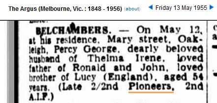 References found (entries & photos) : National Archives of Australia (Barcode 6216218 [NOT EXAMINED]), WW2 Nominal Roll, Australian War Memorial, Past article (size 729kB), Death notice (The Argus 13/05/1955), Funeral notice (The Argus 13/05/1955)