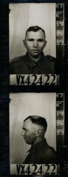 Service & personal summary At enlistment : single. No previous military experience. At discharge : height 5 feet 7 inches, brown eyes, fair complexion, brown hair. Marital status : single. Marks / scars : small scar 0.5 inch long forehead left middle line. Full time war service : A.I.F. 28/06/1940 to 01/03/1946 which included 2073 days active service (994 days within Australia & 796 days overseas). Operational service : Middle East area (embarked from Australia 08/04/1941, disembarked in Australia 23/05/1942), New Guinea area (embarked from Australia 25/07/1943, disembarked in Australia 10/02/1944) & Borneo area (embarked from Australia 16/05/1945, disembarked in Australia 15/11/1945). War badge no. 184921. Discharge certificate no. 296455.