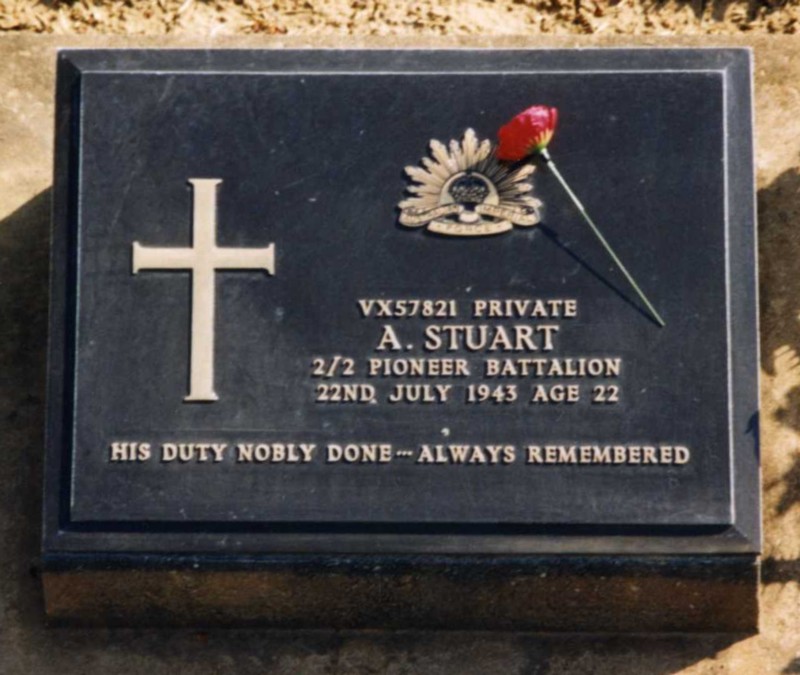References found (entries & photos) : National Archives of Australia (Barcode 6110833 [NOT EXAMINED]), WW2 Nominal Roll, Commonwealth War Graves Commission, Australian War Memorial, Headstone [photo courtesy of K. Fraser (son of VX18403 S. Fraser)], Past article (size 888kB), Past article (size 62kB)