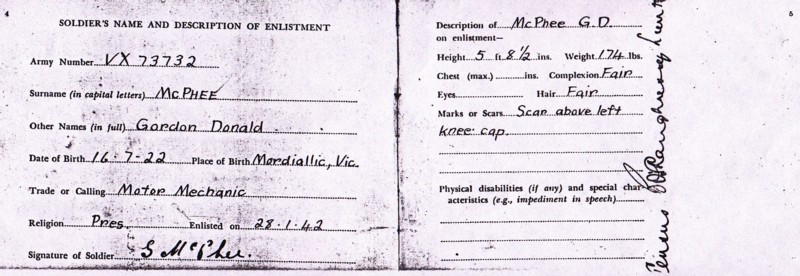 Service & personal summary At enlistment : single, 174 pounds. No previous military experience. At discharge : height 5 feet 9 inches, hazel eyes, fair complexion, fair hair. Marital status : married. Marks / scars : scar above left kneecap. Full time war service : A.I.F. 28/01/1942 to 24/12/1945 which included 1394 days active service (1072 days within Australia & 246 days overseas). Operational service : New Guinea area, embarked from Australia 25/07/1943, disembarked in Australia 26/03/1944. War badge no. 276023 (replaced by 407306 after loss of 276023 badge). Discharge certificate no. 481141.